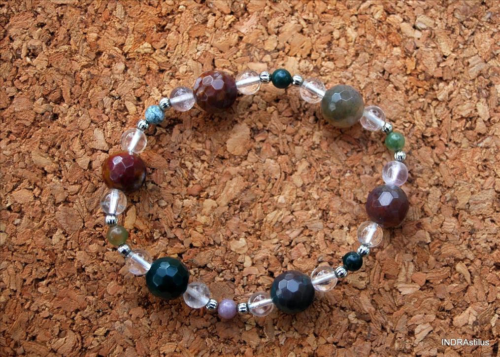 Fazettált és gömb alakú achát féldrágako karköto, hegyikristállyal és allergiamentes fém golyókkal díszítve.