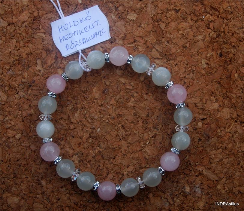 Holdko, rózsakvarc és hegyikristály féldrágakobol készült karköto, antiallergén fém díszítéssel. Gyönyöru, különleges és hatásos.