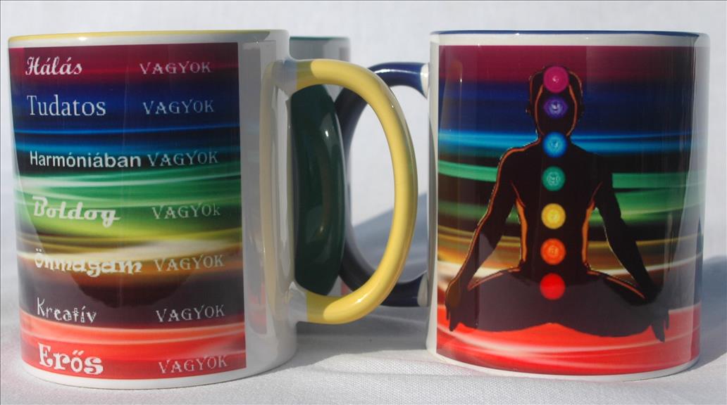 A bögre hátoldalán a csakrákhoz kapcsolódó megerosíto mondatok olvashatók, melyek mantraként muködnek.