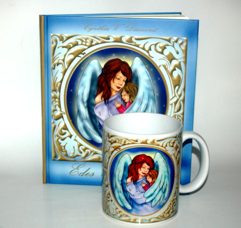 A mesekönyv jelenlegi akciónk keretében egy ajándék bögrével rendelhető, melyen a könyvből való kép látható, hátoldalán abból való idézettel:
