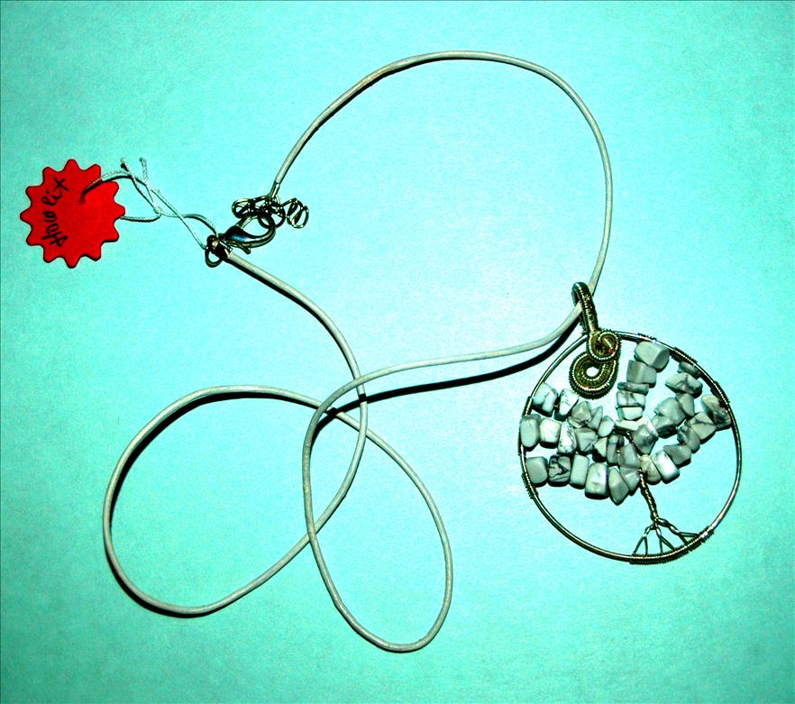 Howlitból és ezüstözött drót felhasználásával kézzel készült egyedi Életfa medál, fehér borön.