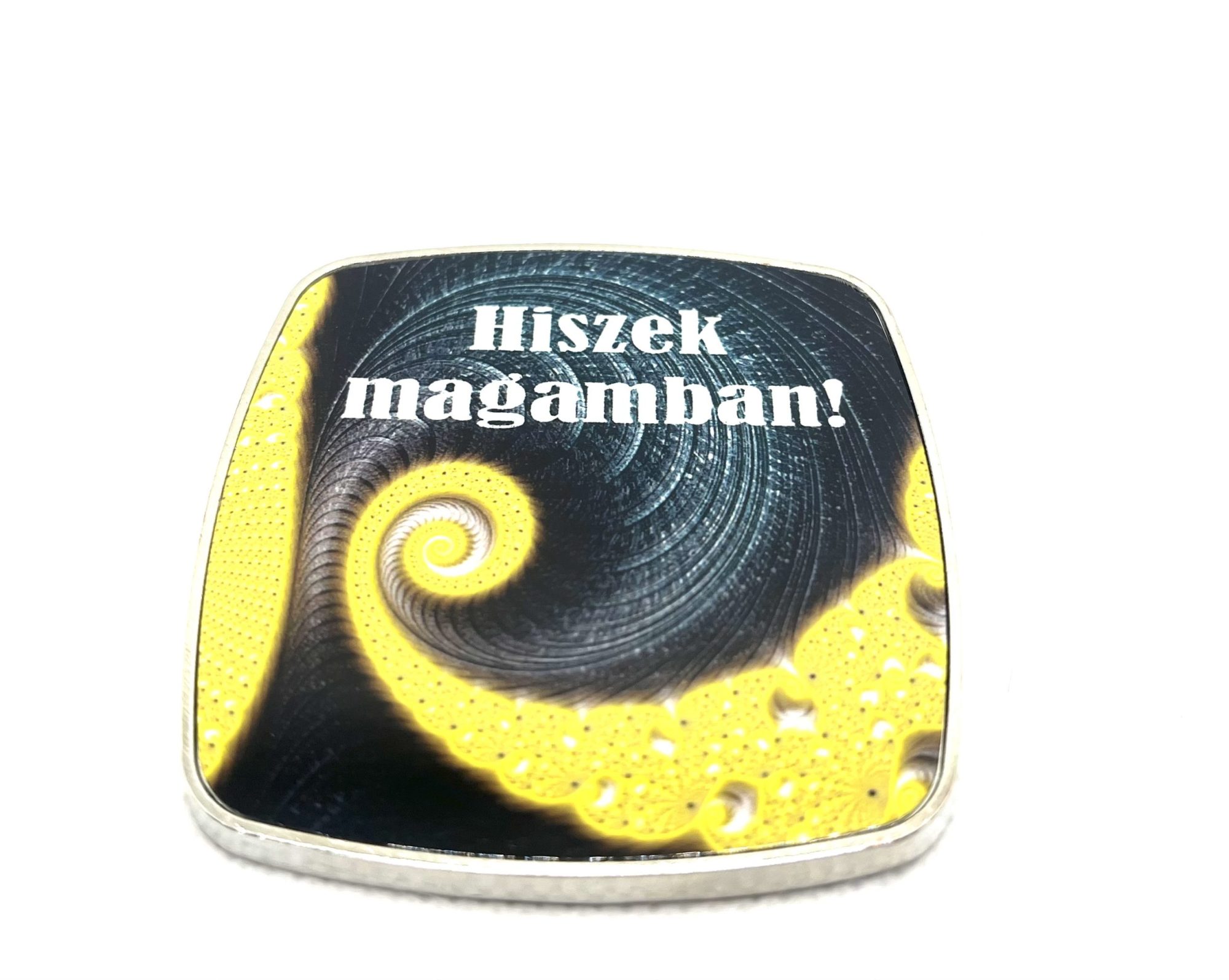 Fém keretben lévo minoségi kidolgozású, négyzet alakú hutomágnes, melynek mérete 6 x 6 cm.