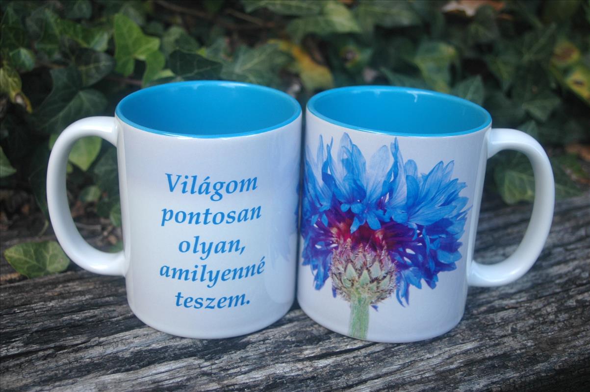 Ez a gyönyöru kék virágot ábrázoló bögre, színes belsejével tökéletesen harmonizál, mondanivalójával jó kedvre derít, bármikor használjuk is azt.
