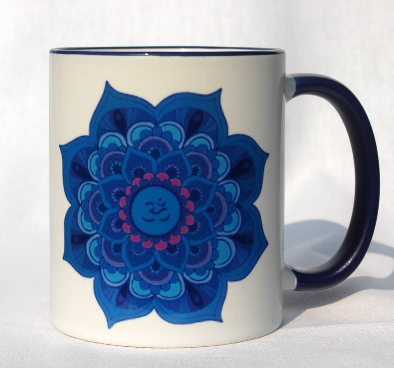 Fényes kerámia börén az ötödik csakrához tartozó kék színu mandala és hozzá illo felirat látható: