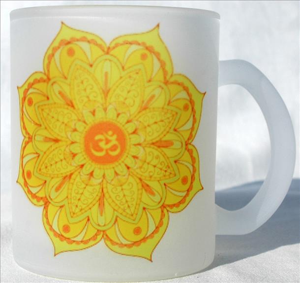 Opálos hatású üveg börén a harmadik csakrához tartozó sárga színu mandala és hozzá illo felirat látható: