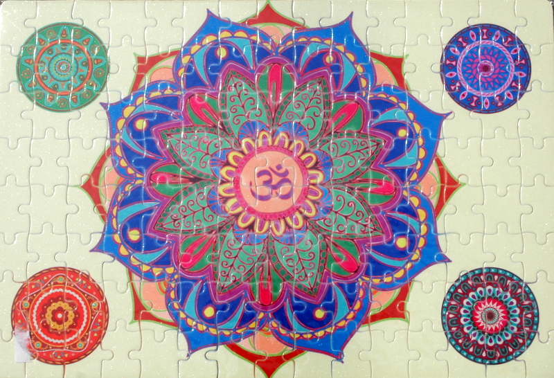 Préselt karton alapú, A4-en méretu, 120 db-os, egy nagy, világos alapon és négy kisebb mandala motívummal díszített kirakó.