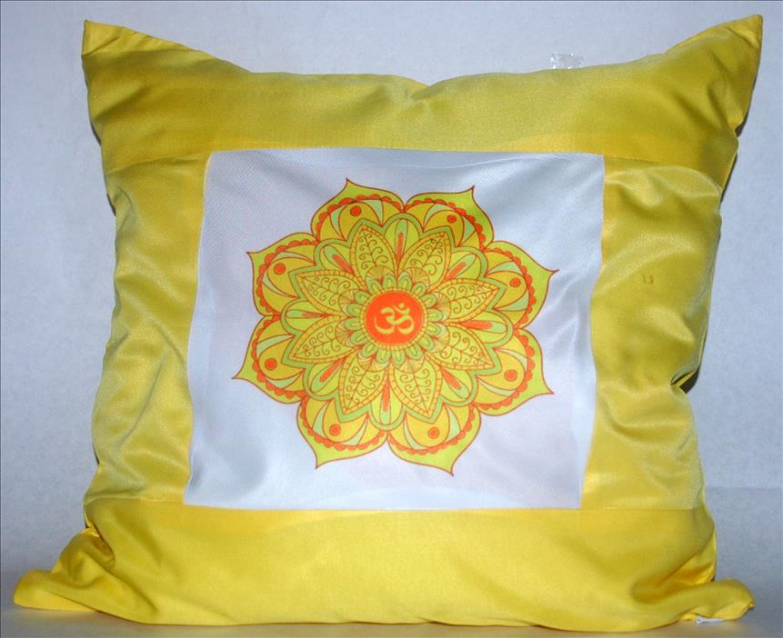 Textilbol készült párnahuzat (100% poliészter). Sárga színu széllel, belül sárga színu mandalával díszítve.