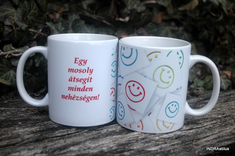 A bögrén felirat is olvasható: „Egy mosoly átsegít minden nehézségen”
