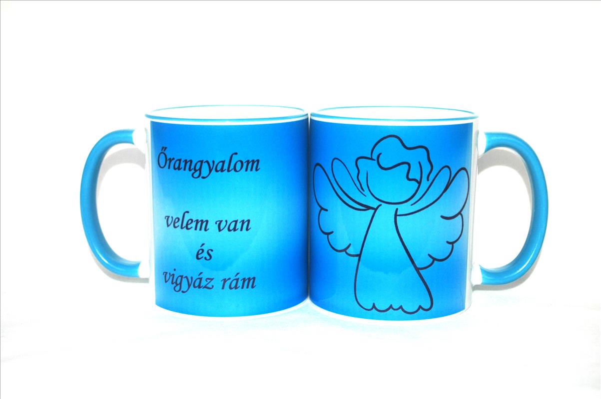 Kék fülu és karimájú bögre angyalos grafikával, felirattal: