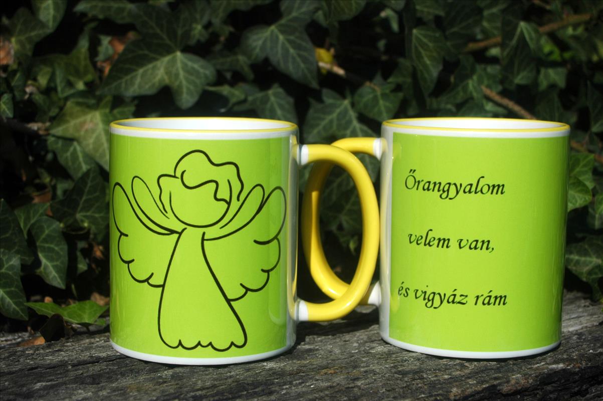Sárga fülu bögre angyalos grafikával, és felirattal: