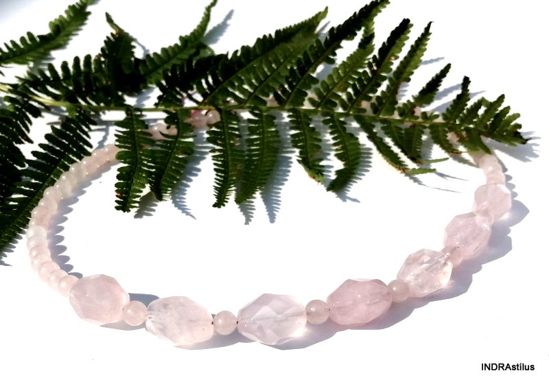 A nyaklánc minoségi rózsakvarc alapanyagokból készült, allergiamentes fém alkatrészeket tartalmaz.