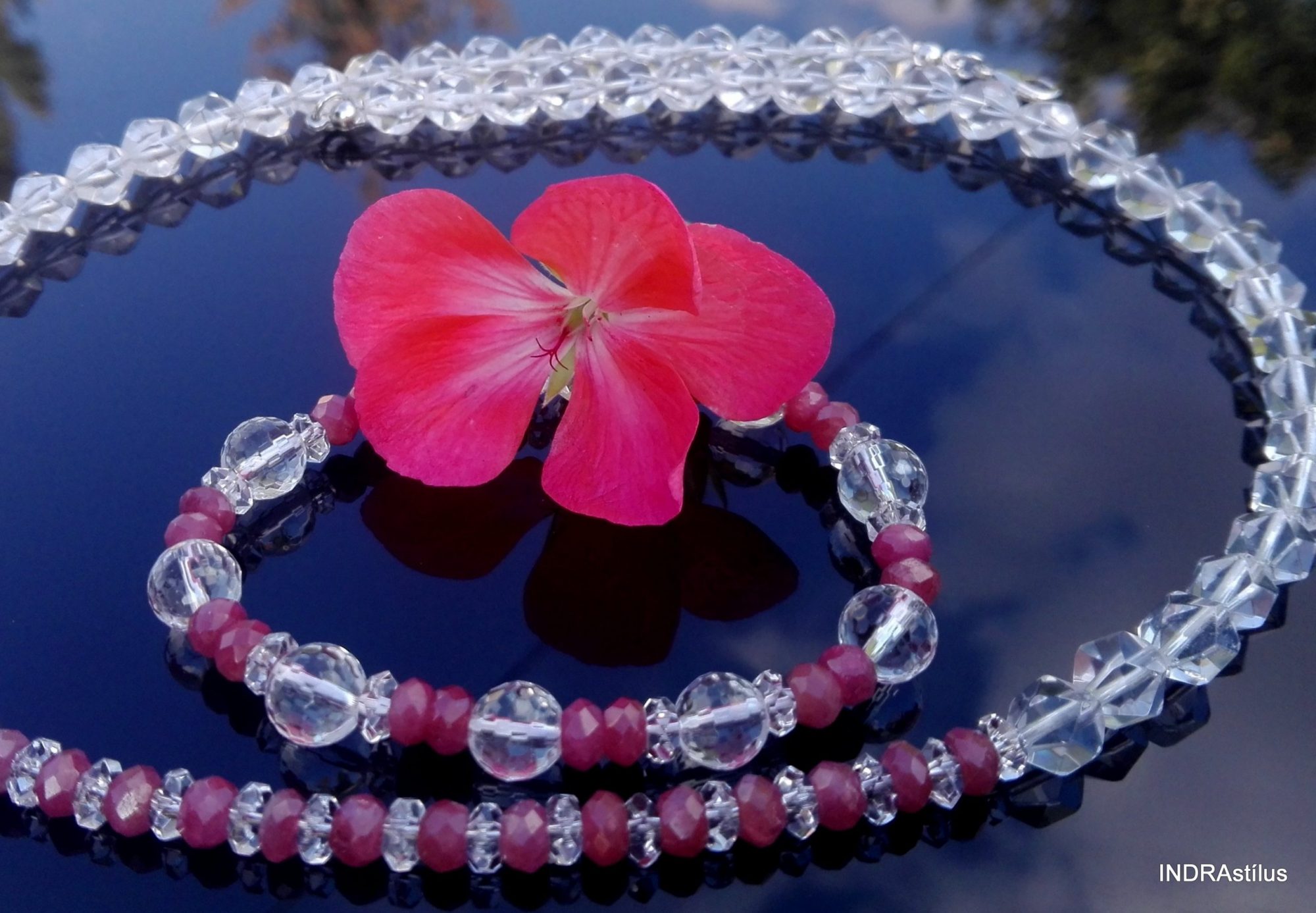 A karköto és a nyaklánc fazettált hegyikristály és rubin féldrágakövekbol és allergiamentes fém alkatrészekbol áll.