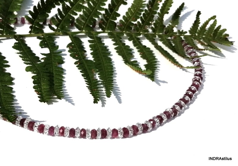 A nyaklánc fazettált hegyikristályból, rubin drágakövekbol és allergiamentes fém alkatrészekbol áll.
